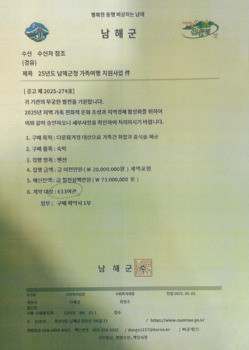 남해군은 지난 9월5일 존재하지 않는 공무원을 사칭한 위조 공문과 명함을 활용한 계약 유도형 사기 시도가 확인됐다며 관내·외 업체 및 군민들에게 각별한 주의를 당부하고 피해 예방을 위한 긴급 대응에 나섰다.이번 사기 시도는 ‘남해군 가족여행 지원사업’을 빙자해 남해군수