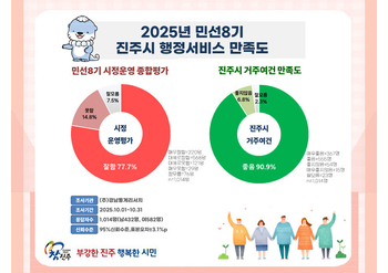 진주시가 실시한 ‘2025년 행정서비스 만족도 조사’에서 응답자의 77.7%가 ‘잘하고 있다’고 평가했다.진주시가 여론조사 전문 기관 ㈜경남통계리서치에 의뢰해 10월1일부터 10월31일까지 18세 이상 시민 1014명을 대상으로 시정 운영 전반에 관한 만족도조사에서 ‘