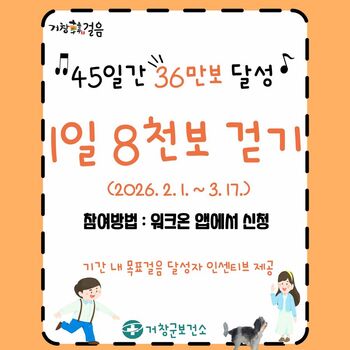 거창군은 오는 2월1일부터 3월17일까지 거창군민을 대상으로 신체활동 증진과 생활 속 걷기 실천 활성화를 위해 ‘거창한(韓)걸음’ 1차 챌린지를 운영한다.챌린지는 45일간 진행되며, 하루 8000보씩 총 36만보 걷기에 도전해 목표를 달성한 사람에게 소정의 상품을 지급