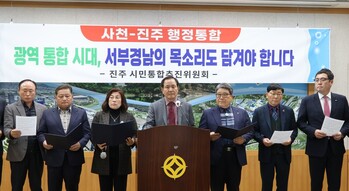 최근 시·도 간 광역행정 통합 논의가 속도를 내는 가운데 경남·부산 행정 통합 논의와 함께 사천·진주 행정 통합에 대한 체계적 행정 대응이 필요하다는 지적이 제기됐다.진주시민통합추진위원회는 12일 진주시청에서 기자회견을 열고 경남·부산 행정 통합 논의