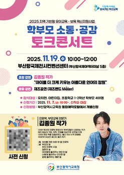 부산시교육청은 오는 19일 부산항국제전시컨벤션센터에서 유치원과 어린이집, 초등 1~2학년 학부모 400명을 대상으로 '아이를 더 크게 키우는 아름다운 언어의 정원'이라는 주제로 토크콘서트를 연다.콘서트는 부산 재즈밴드 'Mler(멜르)'의 공연으로 문을 연다. 이어 김