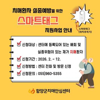 함양군치매안심센터는 치매 환자의 실종을 예방하고 위급상황 발생 시 신속한 발견을 돕기 위해 위치 확인이 가능한 ‘스마트 태그’를 무상 지원한다.스마트 태그는 보호자의 스마트폰 애플리케이션과 연동돼 대상자의 실시간 위치 확인과 이동 경로 기록, 소리 알림 기능 등을 제공