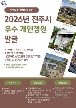 진주시는 시민이 조성·관리하는 우수 개인정원을 발굴해 정원문화 확산과 관광자원화를 도모하기 위해 ‘2026년 진주시 우수 개인정원’을 모집한다. 신청 대상은 관내 개인·법인·단체(시민공동체 등)가 조성·관리하는 정원으로, 개방 가능하고 지속적인 유지관리가 이뤄지는 곳이