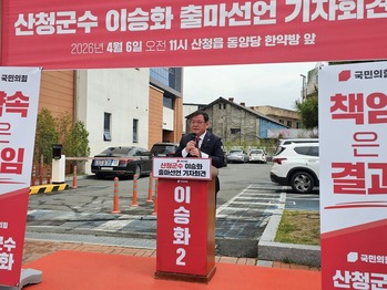 이승화 산청군수가 차기 군수 선거 출마를 공식 선언하며 재선 도전에 나섰다.이승화 군수는 6일 산청읍 시장에서 출마 기자회견을 통해 “끊김 없는 군정으로 산청의 전성시대를 완성하겠다”며 “검증된 경험과 성과를 바탕으로 산청 발전을 이어가겠다”고 밝혔다.이 군수는 “산청