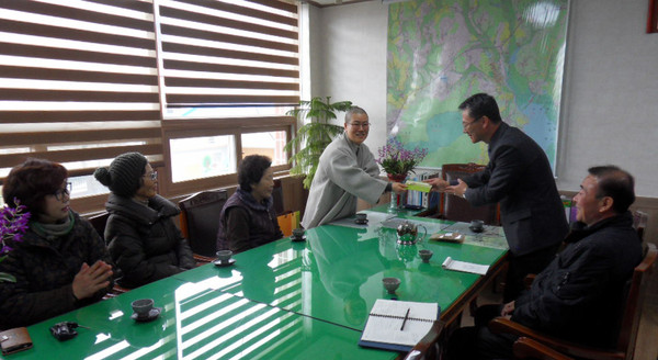 혜범 스님은 “최근 봉행한 방생법회에서 얻은 수익금으로 이웃의 평안을 발원하고자 면사무소를 찾았다”며 “지역 내 도움이 필요한 이웃에 전해 달라”고 자비와 사랑으로 가득 찬 부처님의 마음을 전했다.