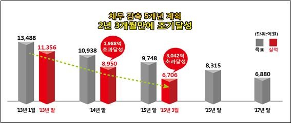 취임 초기 홍준표 지사는 재정건전화를 최우선과제로 삼고, 2013년 1월 당시 1조 3,488억 원의 채무를 2017년 말까지 6,880억 원으로 줄이기로 계획하였는데, 2015년 3월말 현재 채무액을 6,706억 원까지 줄여, 목표를 조기 달성 한 것이다.