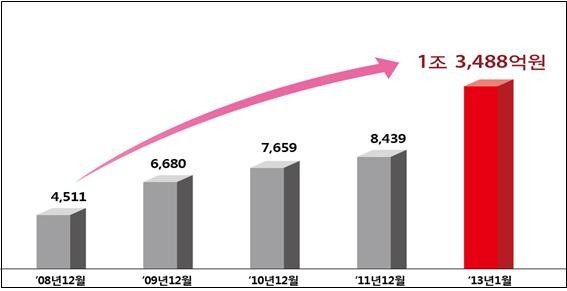 2008년~2013.1 기간중 채무 증가액 현황 * 4년만에 채무 3배 증가