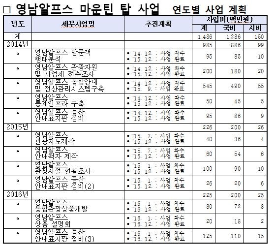 울산시가 주관하고, 밀양, 양산, 경주시가 참여하는 ‘영남알프스 마운틴 탑 사업’은 총 32억 원(국비 29억 원, 지방비 3억 원)의 사업비가 투입되어 2014년부터 2016년까지 3년 간 추진된다.